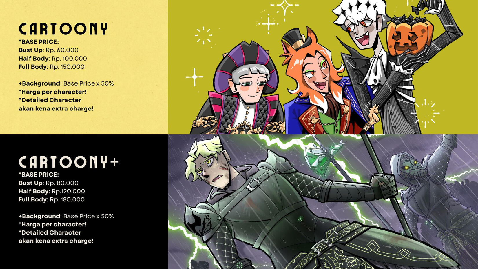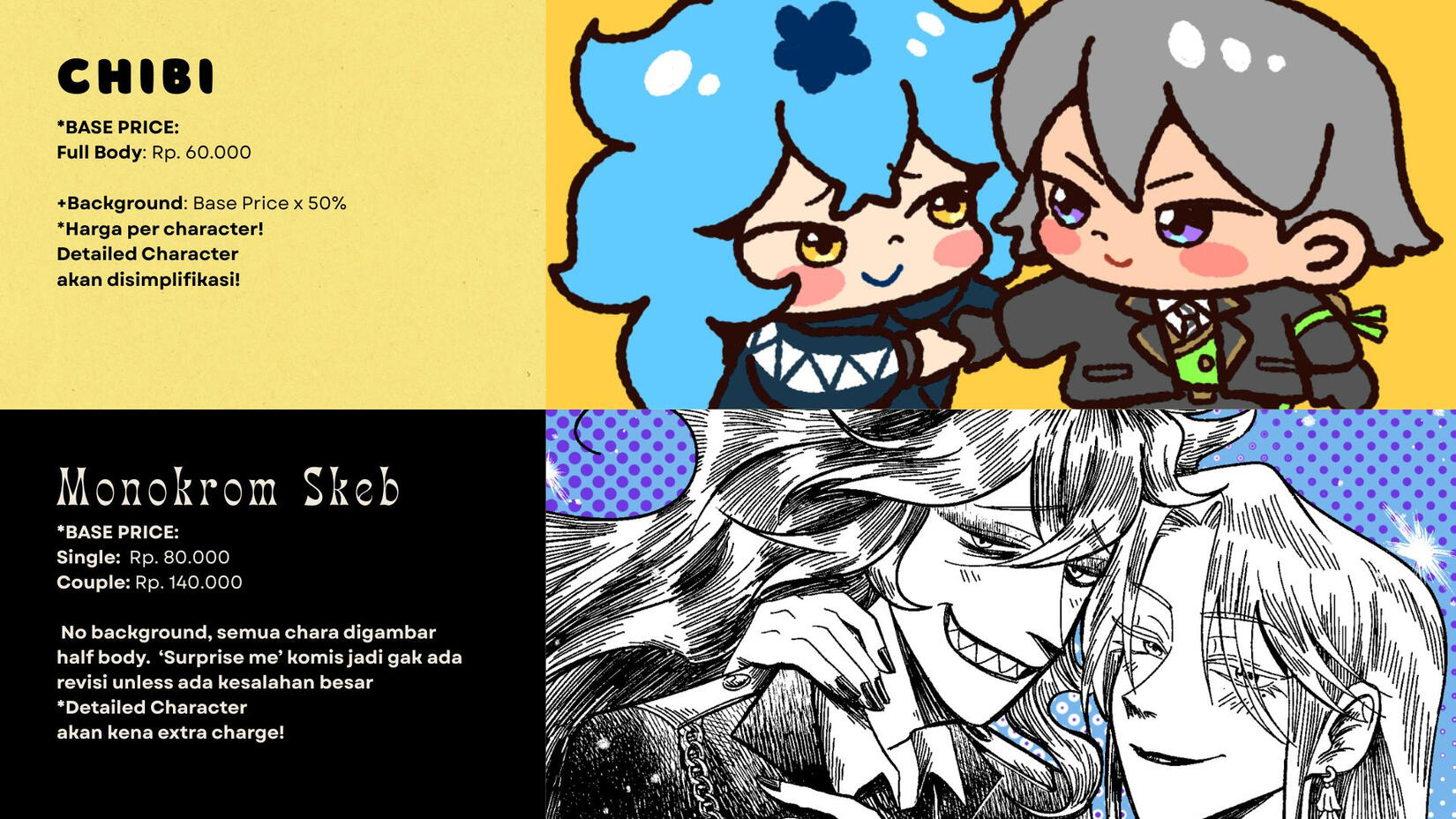 Semua harga berlaku untuk personal use, untuk commersial use harap diinfokan kepada artist. Monokrom Skeb tidak bisa untuk komersil.