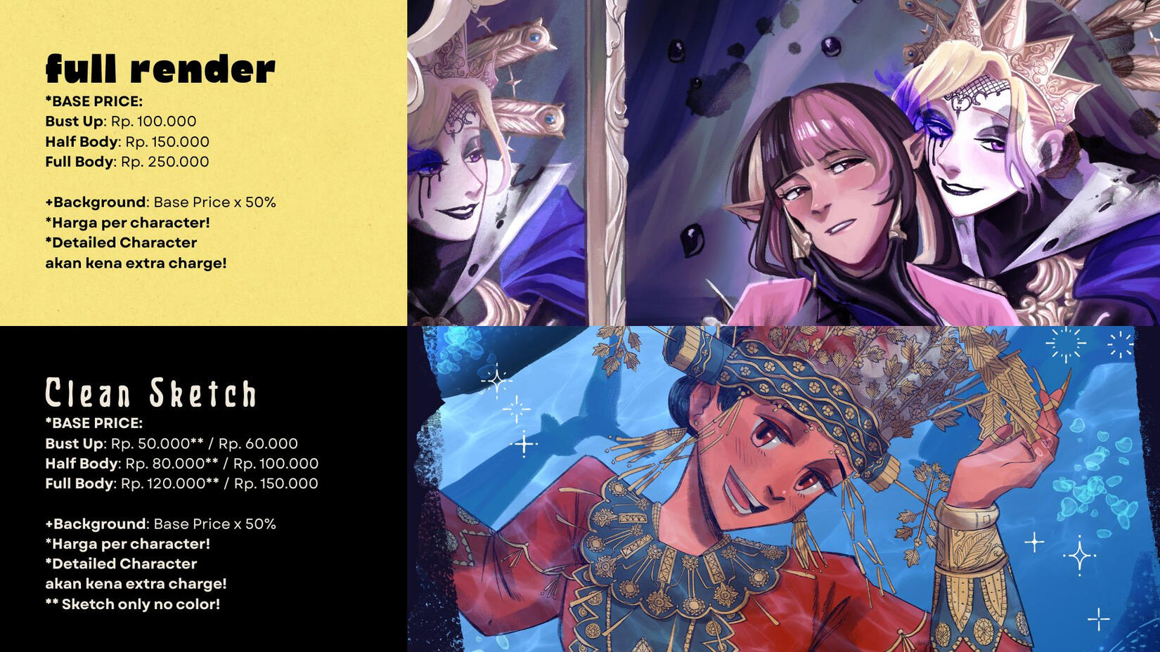 Semua harga hanya berlaku untuk per karakter dengan background plain / simple, A5 300 dpi. Boleh request ukuran canvas.